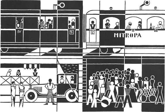 At 25, Arntz depicts the division between rich (against a clear background) and poor (in a gloomy environment). With its four classes, the ‘Mid-Europe’ train symbolizes class society. The railway sign above the left carriage says ‘stop here’, while the sign on the right signals ‘continue on’.